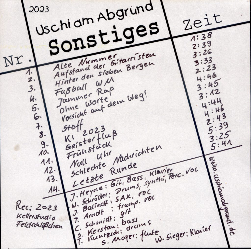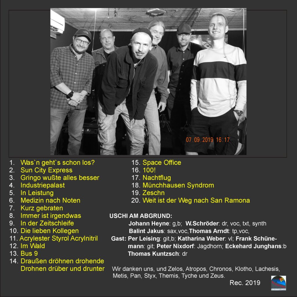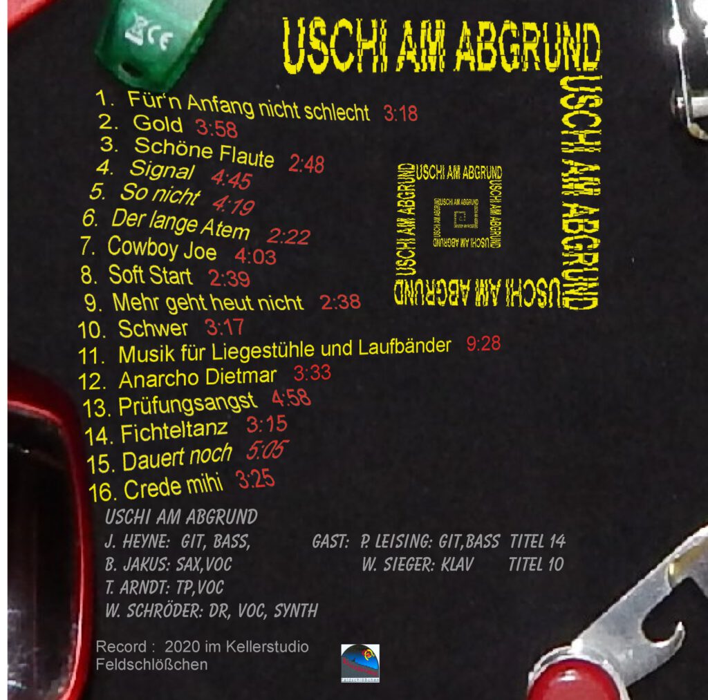 USCHI AM ABGRUND ist keine Bergsteigerkapelle und macht auch keine Bergsteigermusik, jedenfalls nicht im herkömmlichen Sinne. Vielmehr handelt es sich um eine nicht völlig durchorganisierte Formation von Menschen unterschiedlichen Alters und Herkunft mit Hang zu Experimenten und Raubbau am Klang.